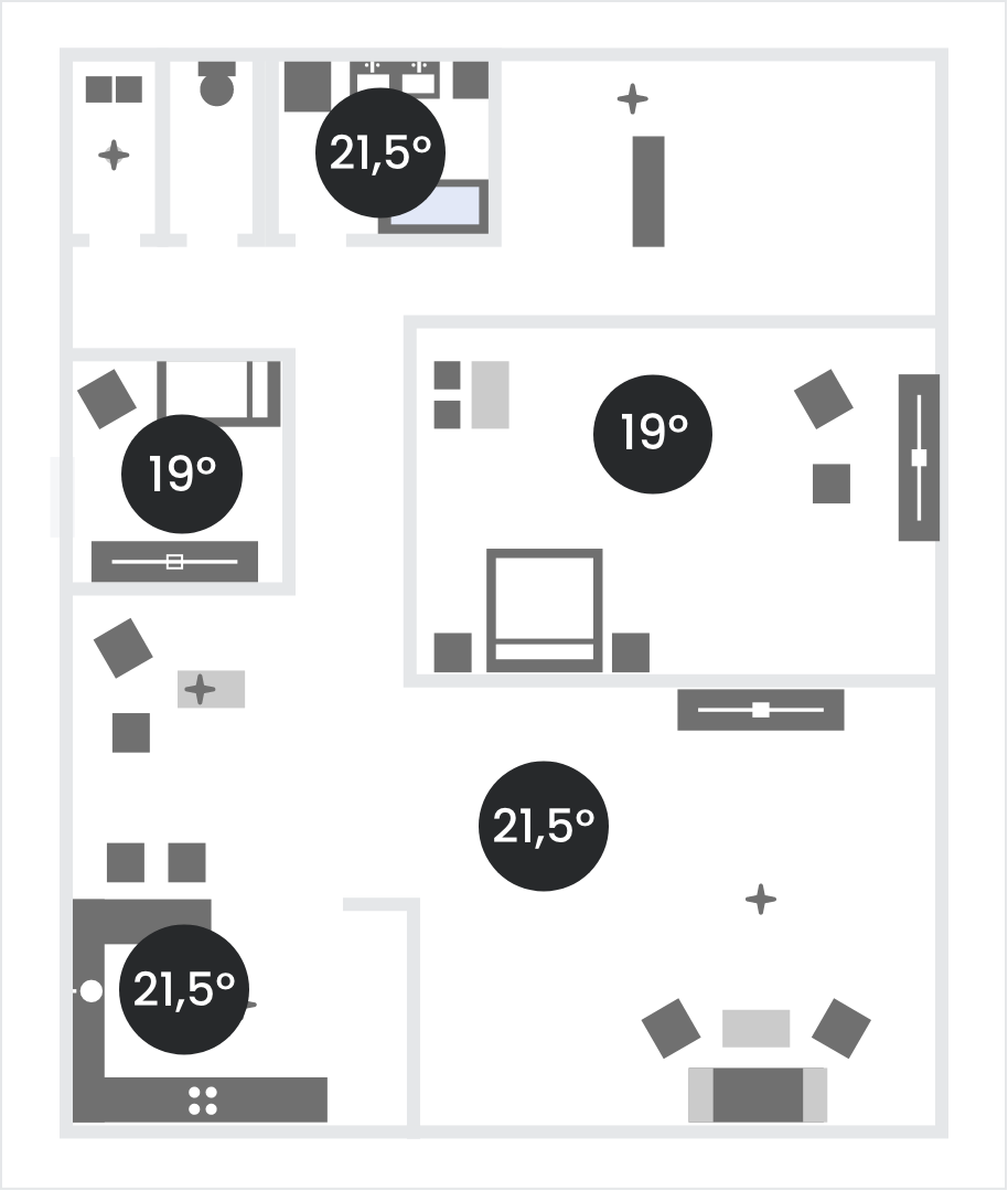 Imagina poder disfrutar de 19°C en el dormitorio, 23°C en el baño y 21.5°C en la sala de estar. Nuestro sistema de climatización inteligente, te permite personalizar la temperatura ideal para cada estancia y mantenerla sin esfuerzo ni ajustes manuales.